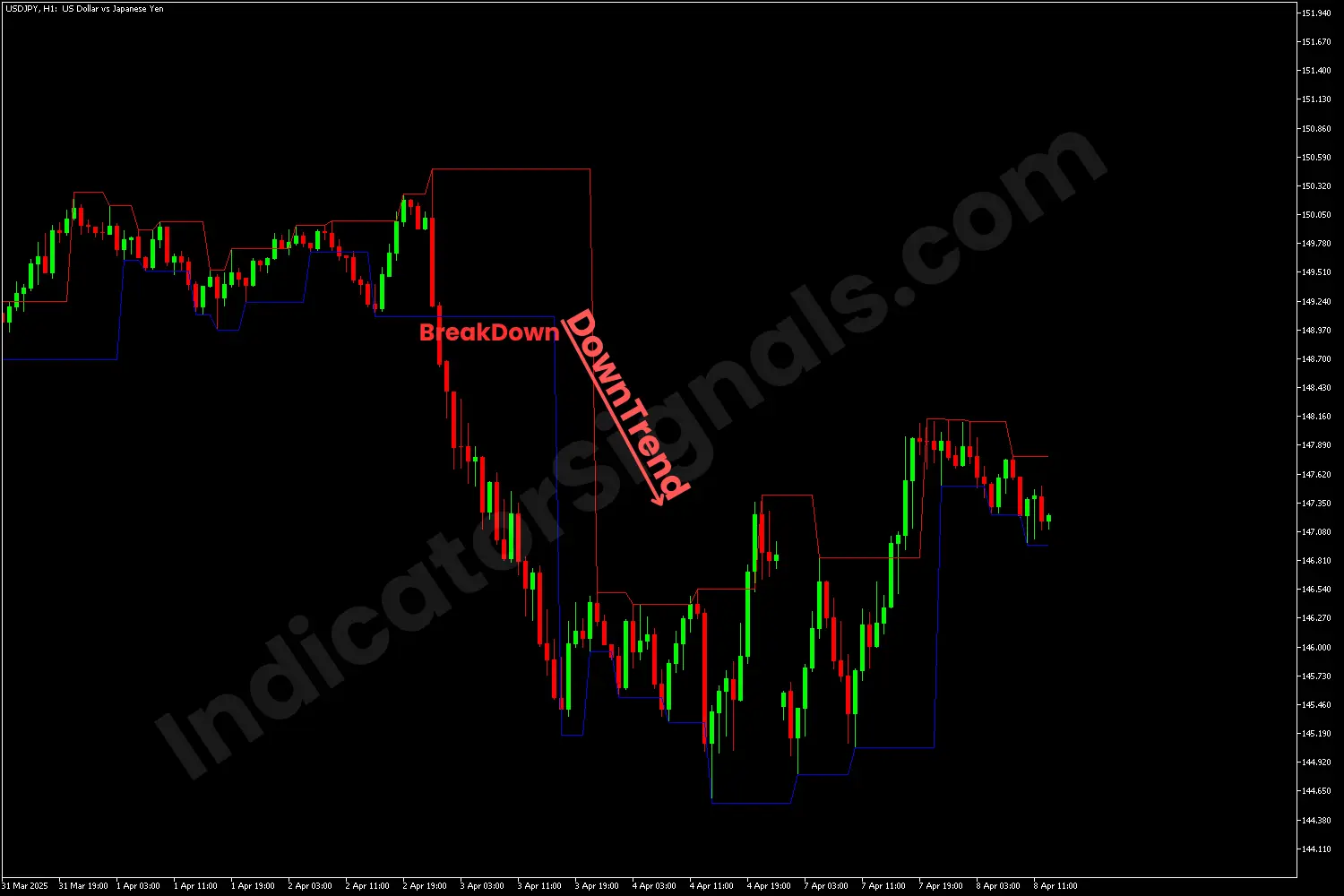 2- In the USDJPY trading example on MetaTrader 4, after a consolidation phase, the price drops, breaking below the last lower line, signaling a potential bearish trend. After two significant red candles, traders could enter short in this situation and exit the trade when the price reenters the channel.